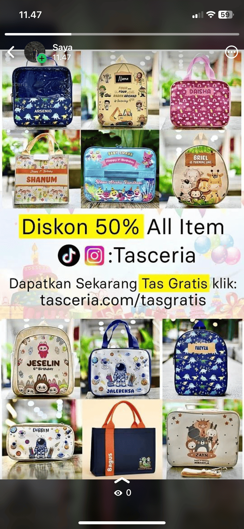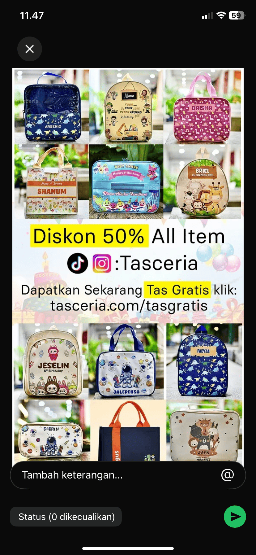 Bunda cuman perlu bantu upload gambar diskon Tasceria ke story whatsapp milik bunda, yuk langsung gercep: